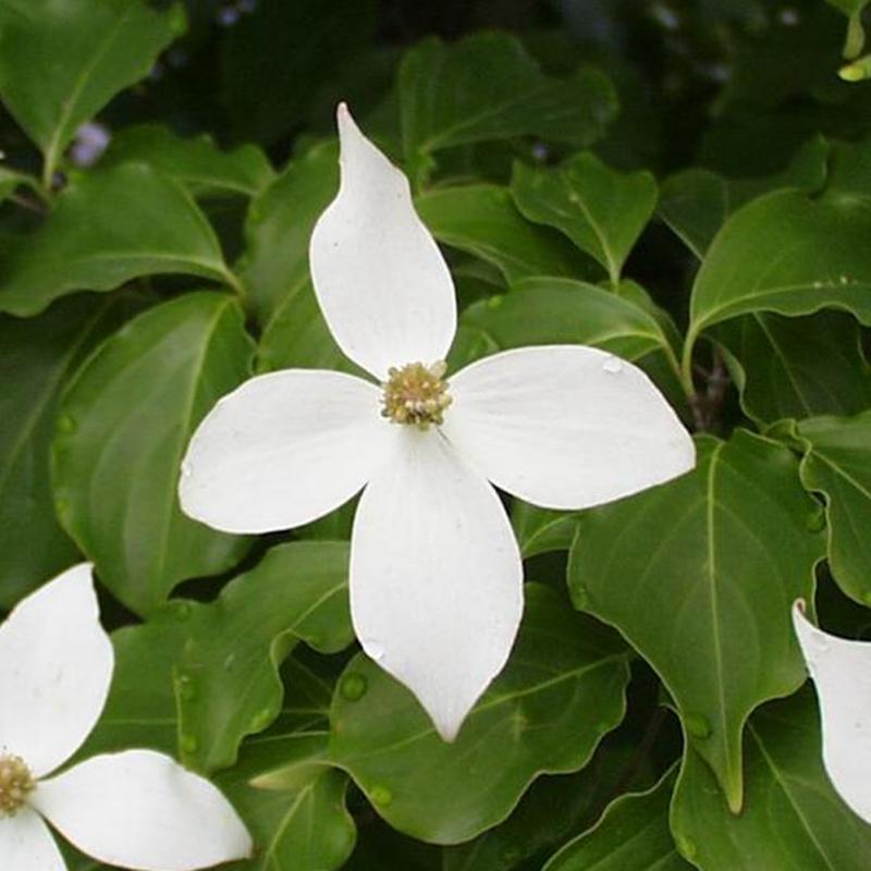 A refined Kousa dogwood cultivar showcasing elegant white blooms in late spring that appear to float above its deep green foliage. With a graceful, layered form, it provides year-round beauty, including reddish-purple fall color and ornamental red fruits.