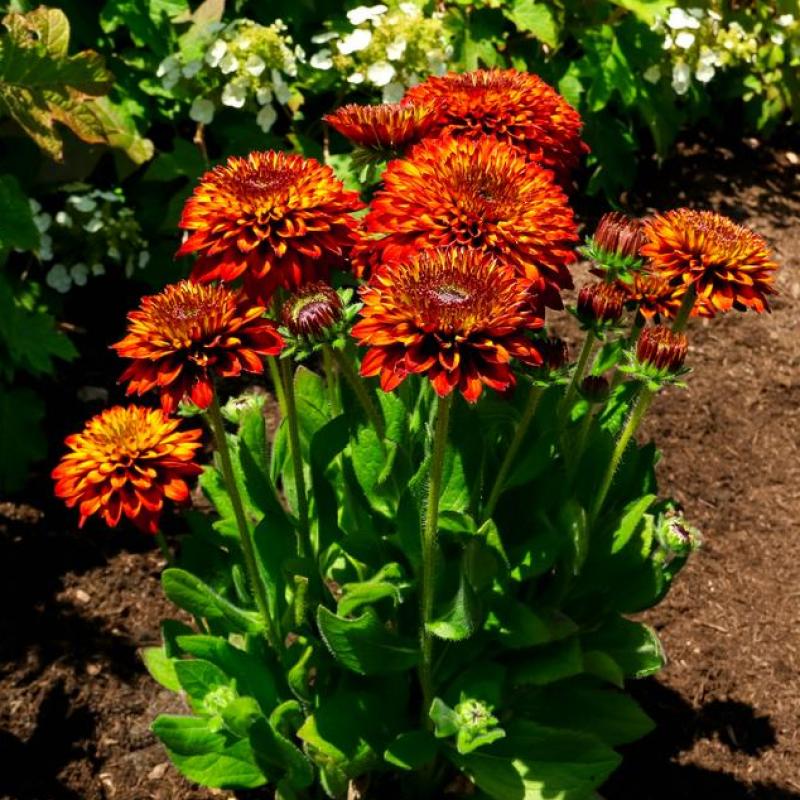Vibrant, double blooms in fiery tones of orange and red light up the garden from summer into fall. Compact and long-blooming, this variety adds bold color and pollinator appeal to sunny beds.
