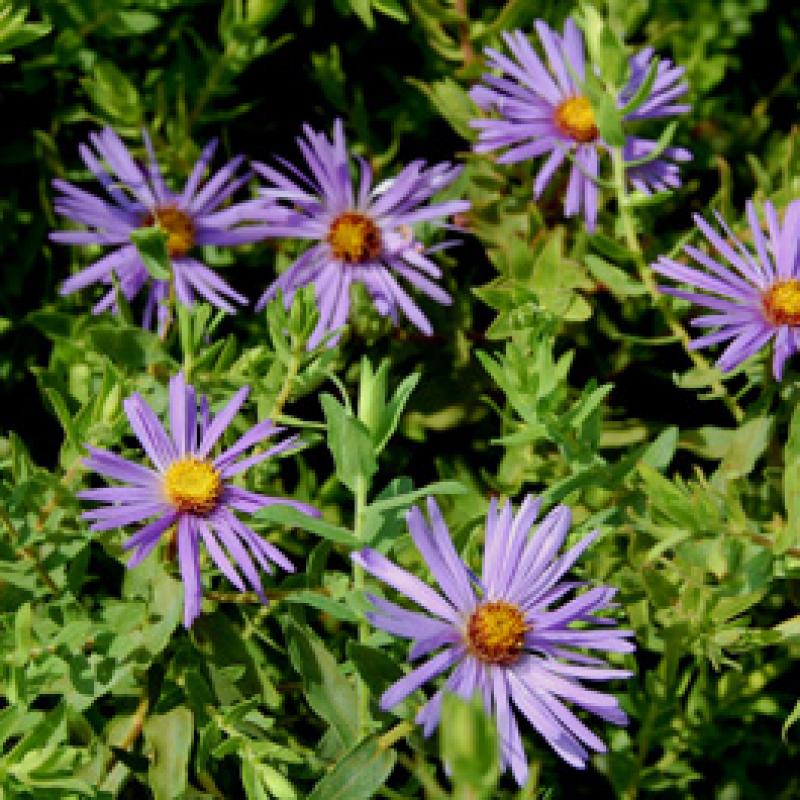 This variety features single lavender blue, daisy-like flowers with yellow centers that emerge above thin, lance-like, green foliage in late September to October.