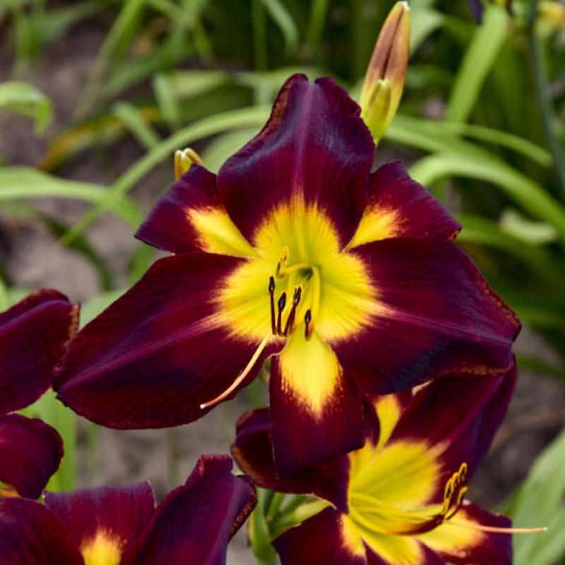 Striking daylily with large, velvety deep red-purple petals and a bold golden-yellow throat. Midseason bloomer with excellent garden presence.