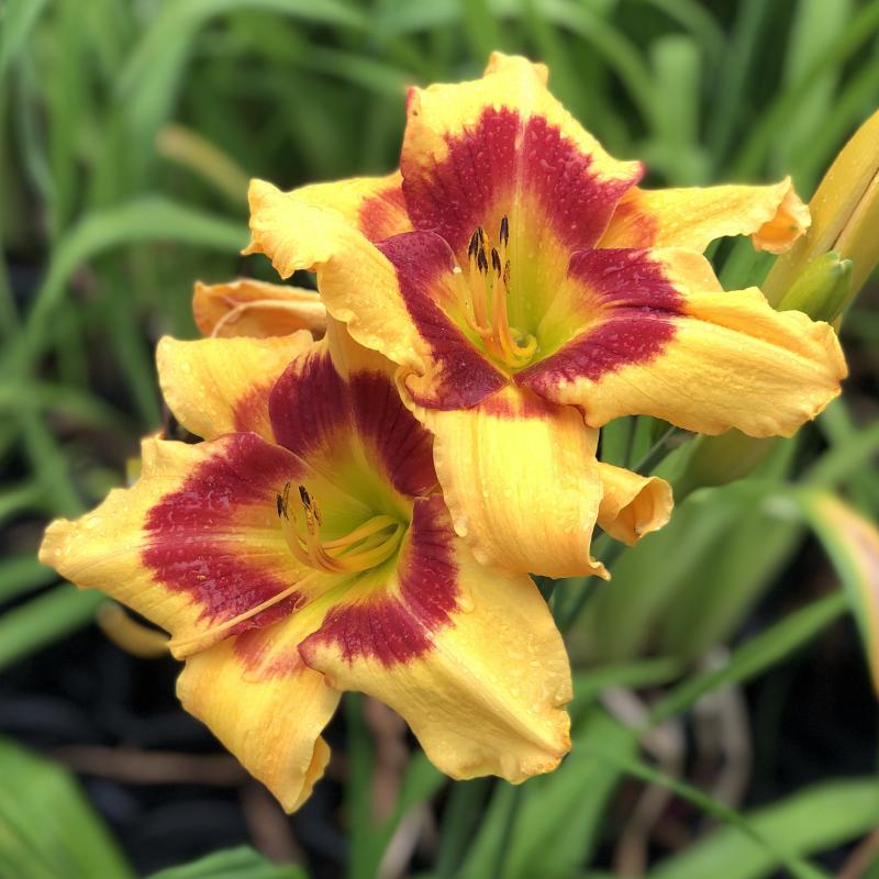 A drought and salt tolerant selection, 'Tiger Swirl' sports huge, 6.5" triangular-shaped flowers that are light golden yellow with a pronounced raspberry red eye. Its bottom sepals are smooth, often twisting or curling into a swirling motion.
