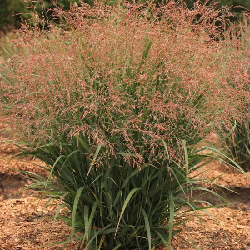 An airy, upright ornamental grass with soft green foliage topped by clouds of smoky rose-pink flower panicles in late summer. Adds movement, texture, and seasonal color, with attractive golden tones in fall.
