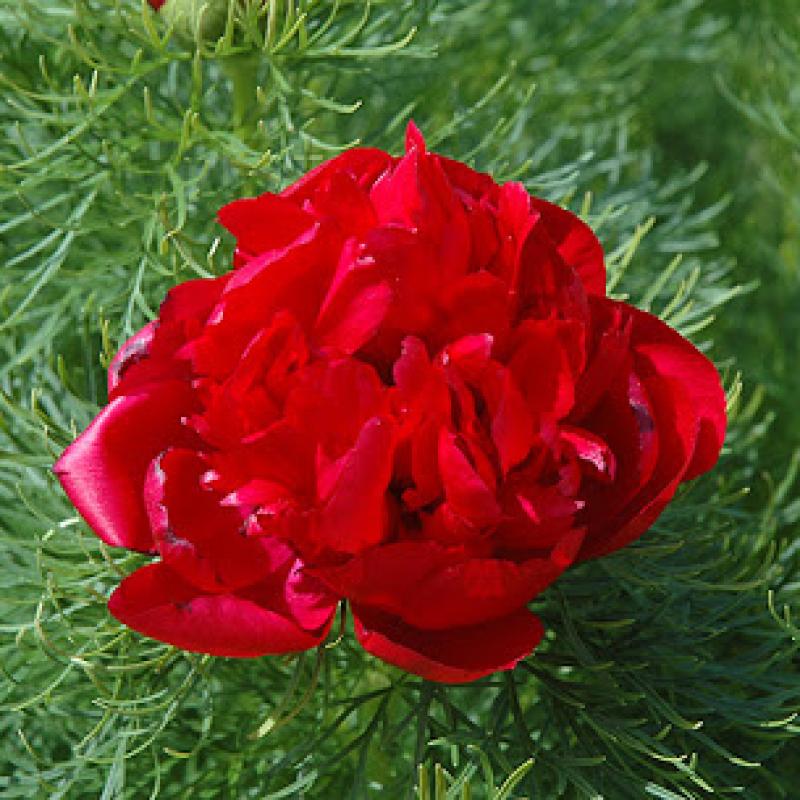 Double red flowers set against a backdrop of fernlike, finely dissected foliage sets this variety apart from all other Garden Peonies. This selection blooms a couple of weeks earlier than the others in late spring.