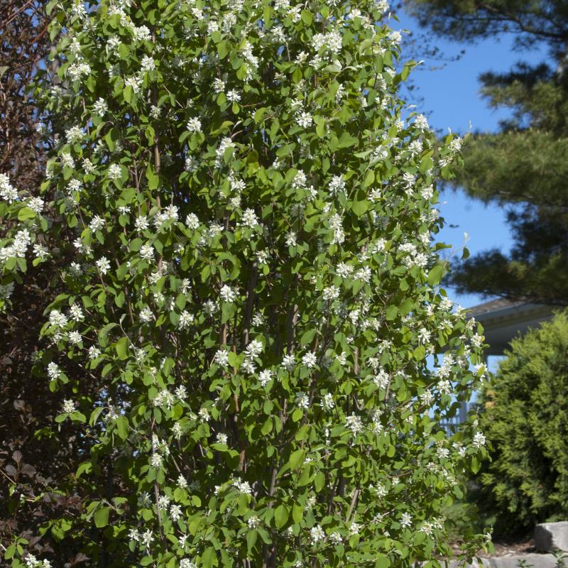 Acting as a small tree or large shrub with its unique upright nature, this variety will be smothered in dainty clusters of white flowers in late April. The bark is a crisp gray and the rounded foliage is deep green before turning red and orange in fall.