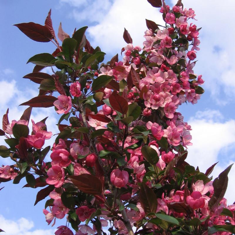 'Gladiator' features a profusion of bright pink, fragrant flowers against glossy bronze-purple leaves in late April to May that highlight a strongly upright shape. Deep purple-red persistent fruit in fall extends the interest.