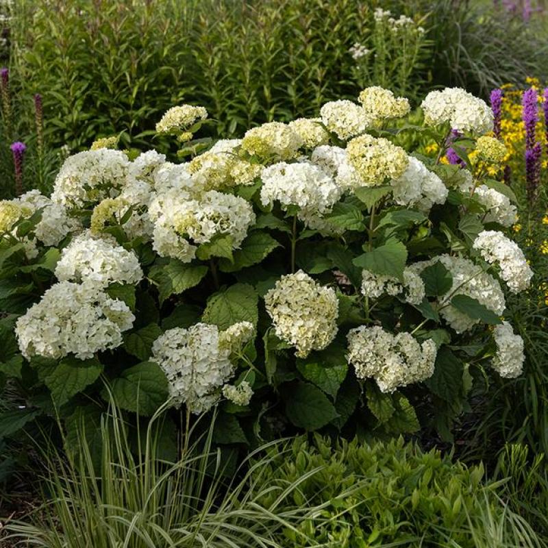 This improved smooth hydrangea offers an abundance of large, white flower clusters held upright on strong stems. A tidy and reliable native shrub that blooms on new wood and shines in both formal and naturalistic designs.