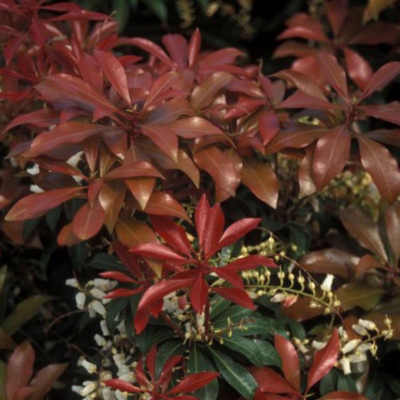 The beautiful, fiery red new growth of 'Mountain Fire' will mature to a lustrous deep green. A prolific producer of broad, pendulous white flower clusters, this is an excellent shrub for foundation planting or landscape groups.
