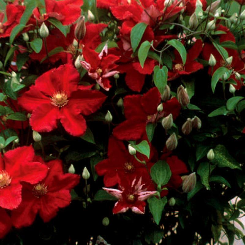 The bright magenta red flowers of 'Ernest Markham' appear from July to October on this vigorous vine. Providing adequate light will encourage flowering. (Pruning Group 2)