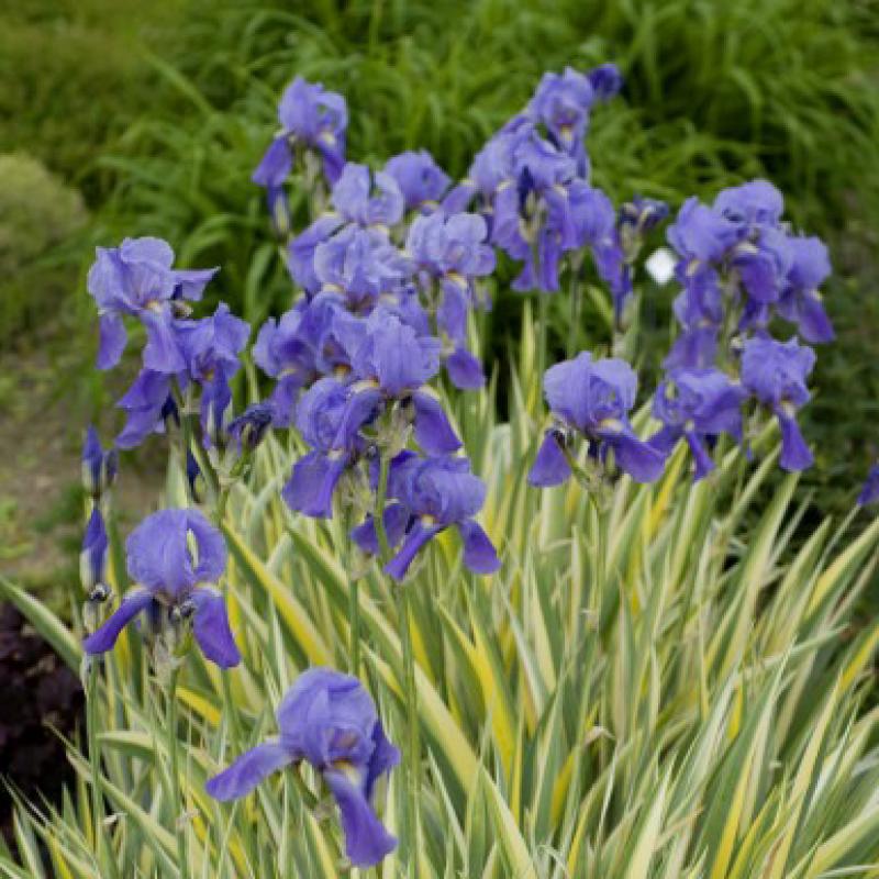 This selection features green and white variegated leaves and large dark purple flowers that appear in early July.