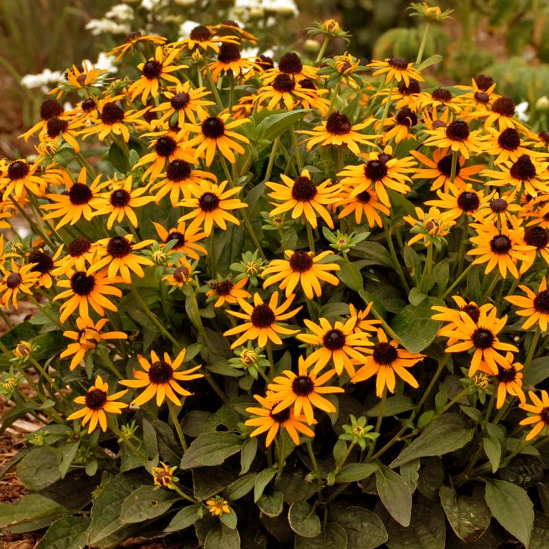 'Little Goldstar' produces compact domes of 2-2.5" golden yellow blossoms with dark brown centers that almost obscure the underlying deep green foliage from mid-July to September.