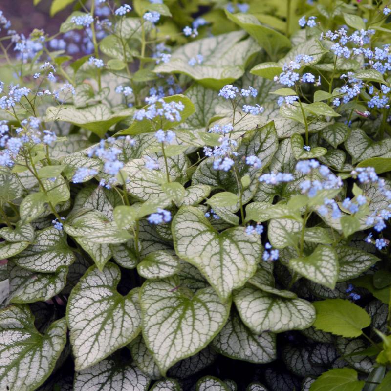 The heart-shaped leaves of this variety feature frosty silver overlays and dark green veins that contrast well with its dainty array of abundant blue flowers in May. A must have for brightening up shady locations!