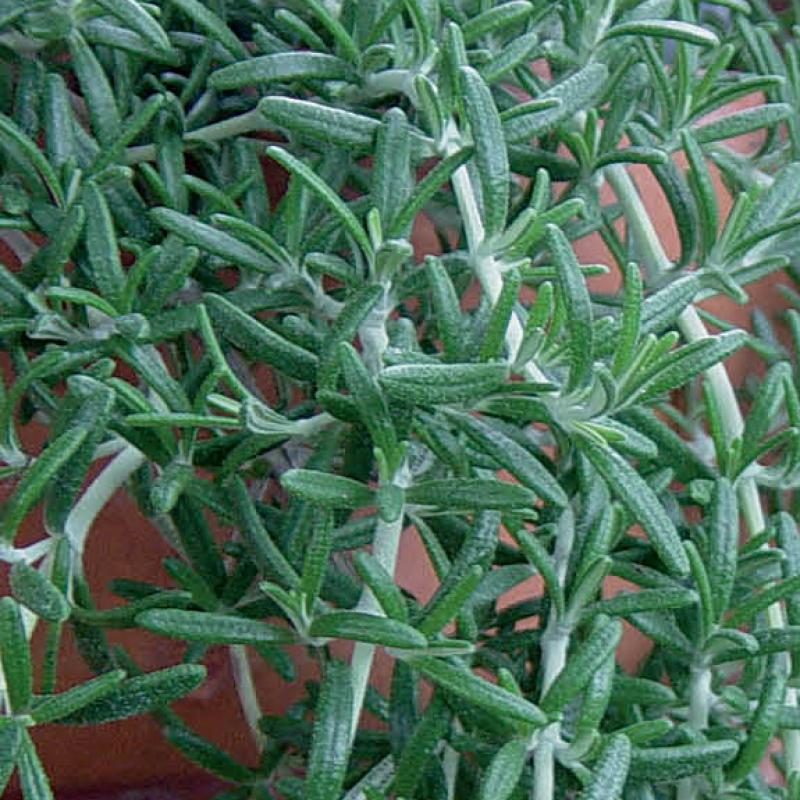 A low-growing cultivar of the commonly available rosemary with aromatic, deep green, needle-like foliage. Pale blue flowers adorn this selection in July.