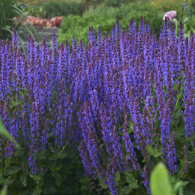 'Violet Riot' produces vivid deep violet flower spikes atop mounded, dark green, aromatic foliage from late May to June.
