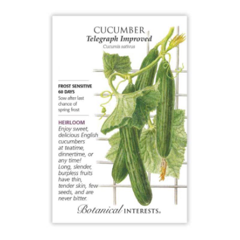 The English cucumber is longer (up to 18") and thinner than traditional cucumbers, with very small, soft seeds. 'Telegraph Improved' was developed in the 1800s for growing in greenhouses, but is now a favorite of home gardeners.