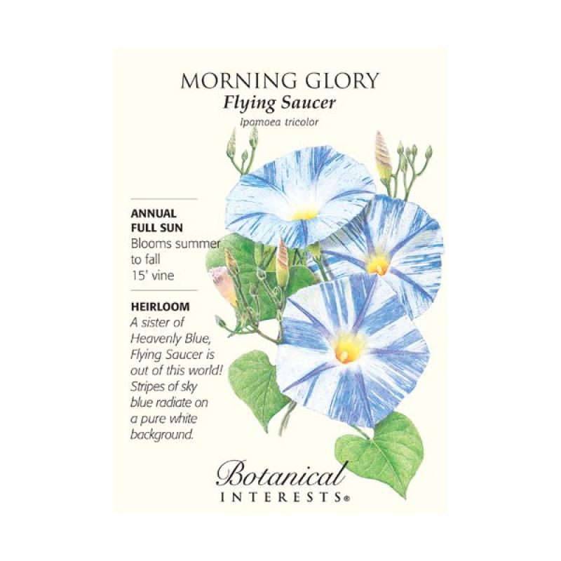 If you love morning glories, try this beautiful, 5" white variety with irregular blue pinwheel stripes, and sometimes blue flecks; every flower is different. Gorgeous grown alongside a blue or purple morning glory.