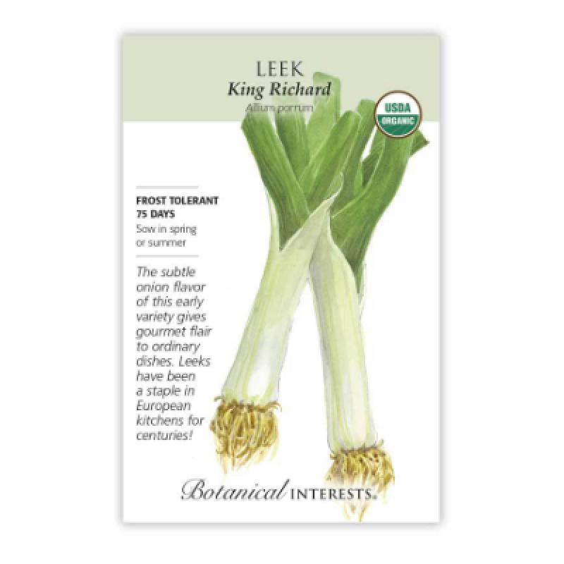 Leeks' mild but rich onion flavor and cold tolerance make them a favorite in home kitchens and gardens. This onion relative has compact stems that thicken but do not form bulbs like onions. 'King Richard' produces extra long white stems early.