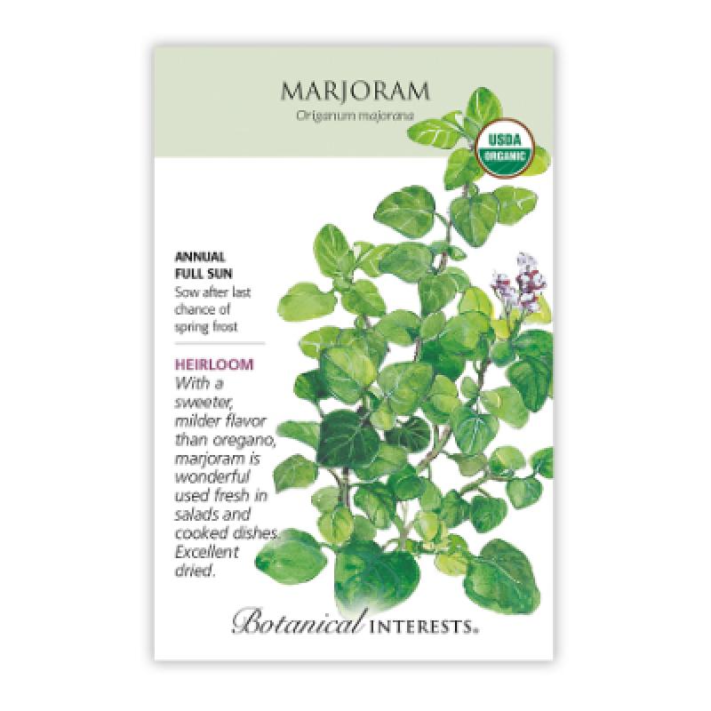 Also called sweet marjoram, its flavor is considered milder but more complex than its relative, oregano. Some describe the flavor as having a hint of balsam. A very popular ingredient in German sausage and herb breads.
