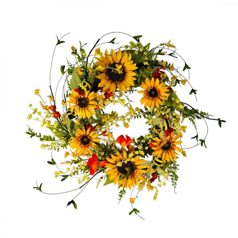 This artificial sunflower wreath is a true gem that will look great for spring, summer, and fall decor.  Yellow sunflowers and orange cosmos are surrounded by berries, leafy twigs, and fern on a hand wrapped stem base.  Yellow and black bees flit among the blooms adding cheer.