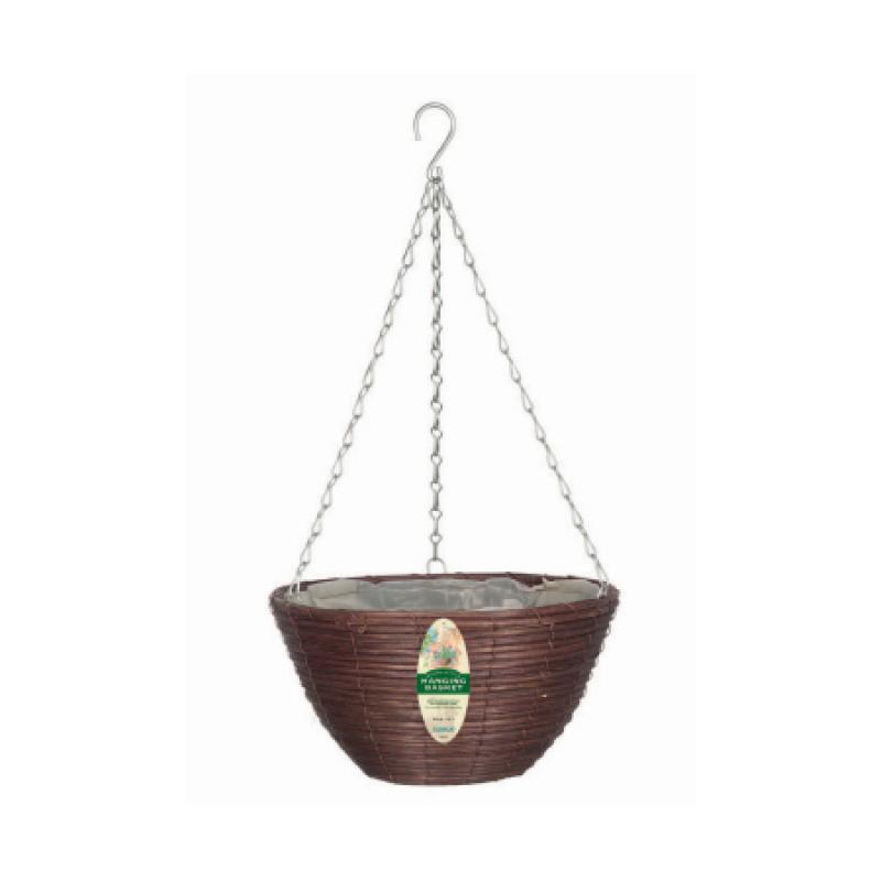 Rattan hanging basket has a galvanized steel frame and chain with a flat bottom for easy filling. A plastic liner included for indoor and outdoor use.