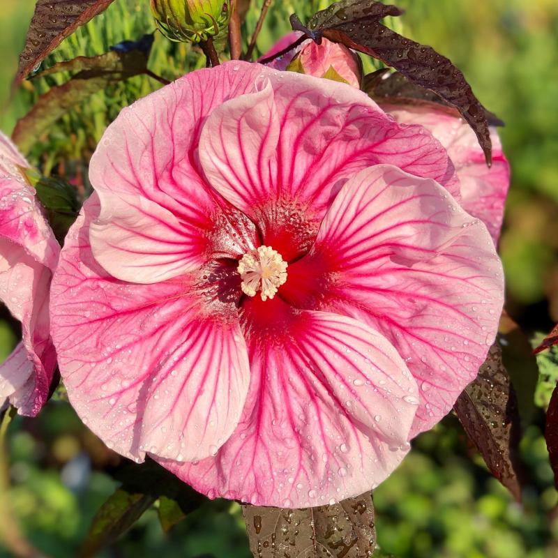 This variety's very large 8-9" white flowers are flushed with deep cherry-pink and have deep red centers. A compact plant, it features glossy olive-green foliage with bronze shading and will bloom from late July to early September.