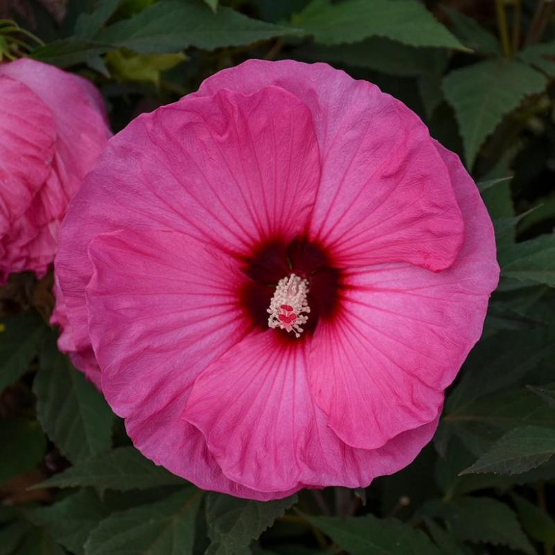 'Summerific Candy Crunch' has a fantastic garden presence! 8" bright bubblegum-pink flowers with near-black, dark red eyes are produced from top to bottom and its rich, bright green leaves will complement the striking flowers.