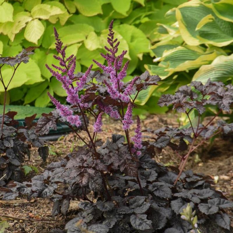 A striking shade perennial with rich, near-black foliage and contrasting raspberry-purple plumes. This unique variety provides bold texture and color in shady garden beds, borders, or woodland edges, while also being deer resistant and pollinator friendly.