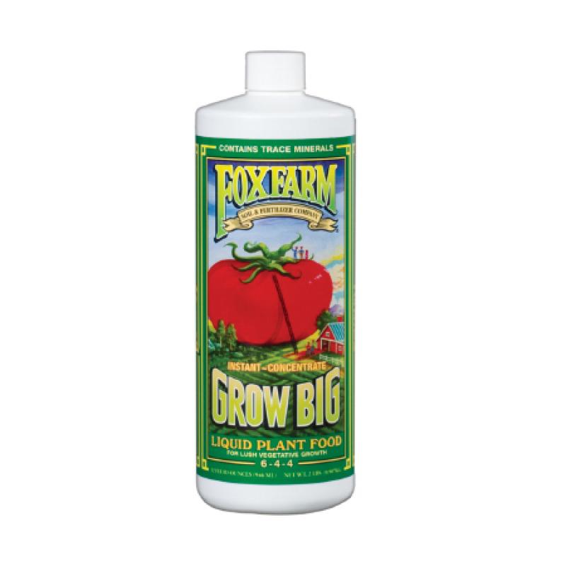 FoxFarm Grow Big Liquid Plant Food (6-4-4) is a fast-acting, water-soluble fertilizer for lush, compact vegetative, growth. Use early in the season when young plants need an extra boost.