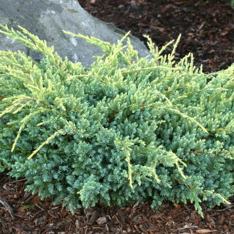 Stunning creamy-yellow new foliage combines beautifully with last years blue-green needles and produces a dramatic bi-colored effect on a dense, wide-spreading plant.