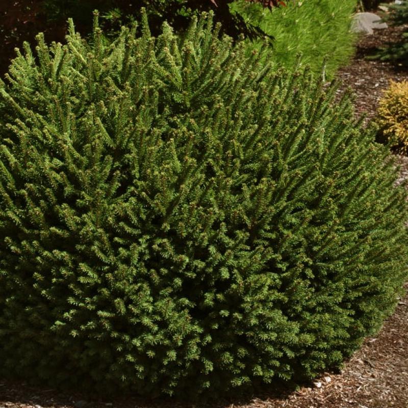 The short, dark green needles of this uniformly branched plant creates a globose habit when young, then spreads with age into a rounded habit with shoots that point out or up.