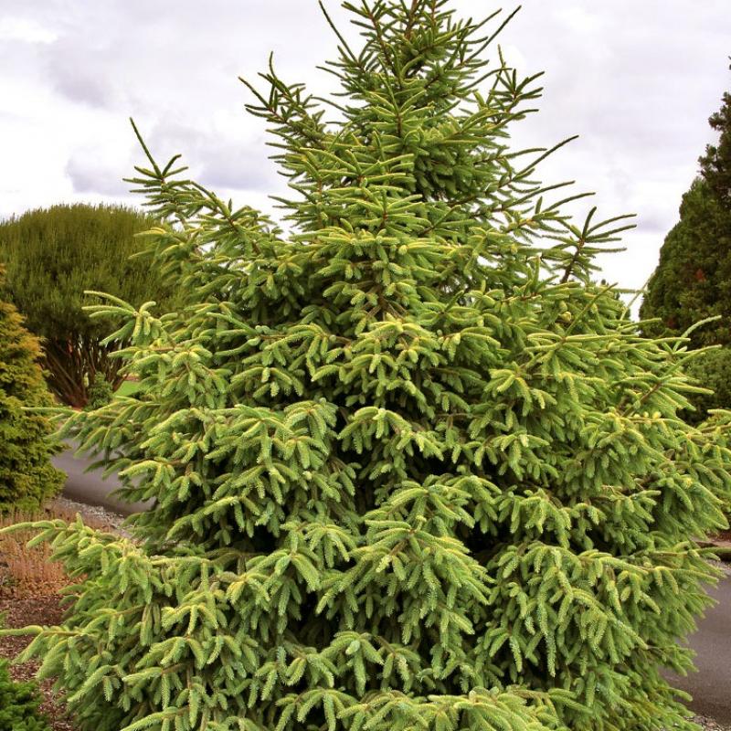 So uniquely beautiful, this selection is difficult to describe. Blue-gray needles overcast with golden yellow on the top of the branches enhances the horizontal branch structure of this broad, upright conifer.