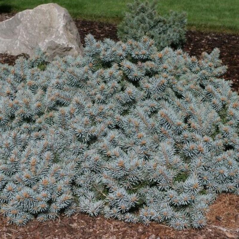 This dwarf, blue, bun-shaped selection has relatively long, widely-angled needles. It will reliably maintain a mounding or globose habit without any tendency to develop a leader. Its excellent blue color will also add year-round interest.