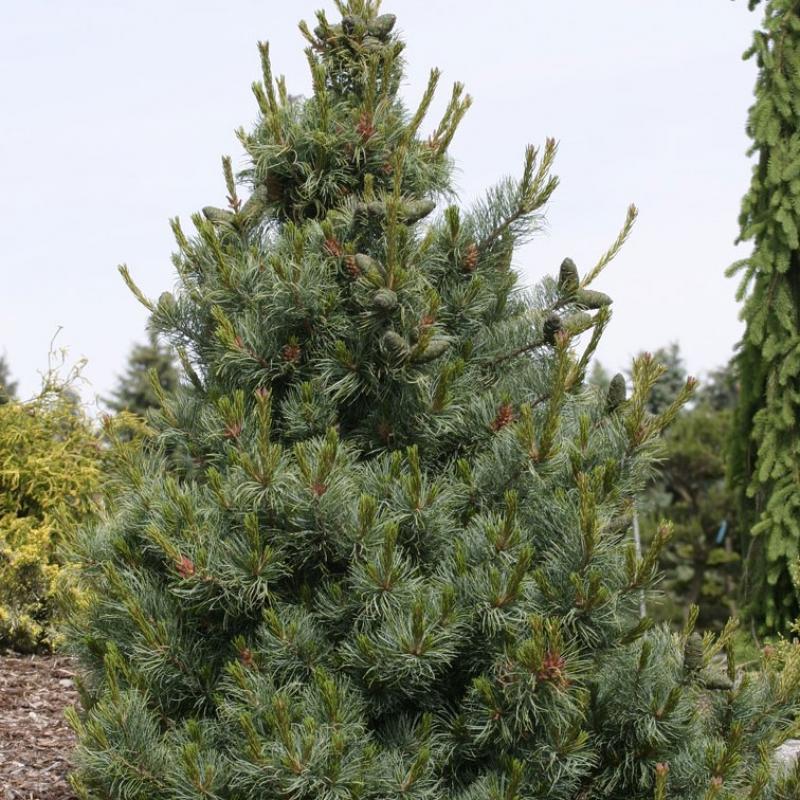 The bright carmine red pollen cones of this variety provide a dramatic contrast to the long, twisted, blue-green needles in spring. 'Bergmani' attains a wide, irregular, upright habit from a compact, rounded form.
