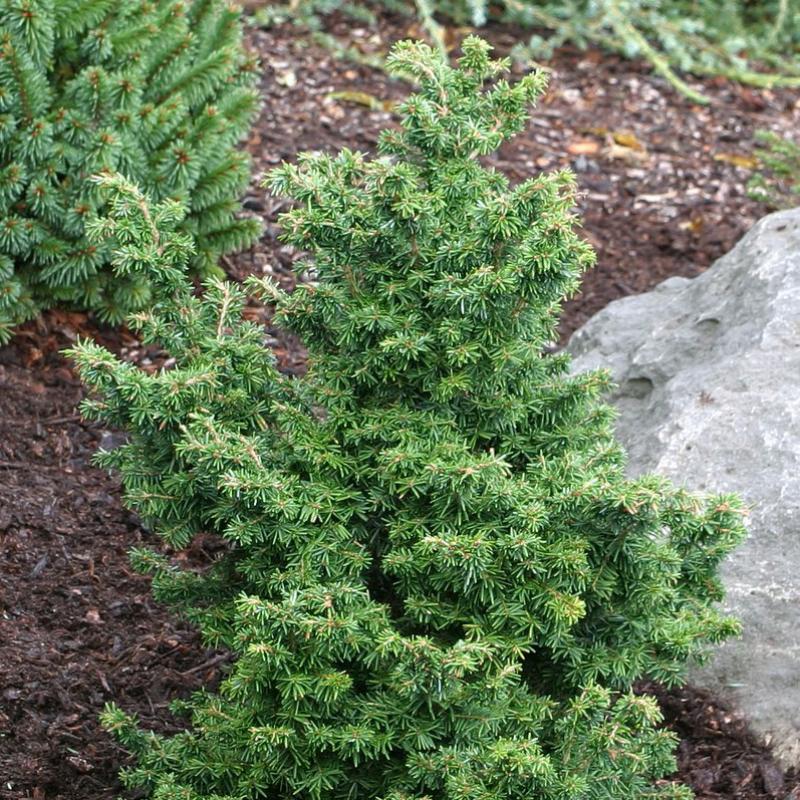 A densely branched, irregularly conical dwarf with a broad, pyramidal form and congested, dark-green foliage, 'Jervis' will grow slowly into an irregular, upright form with prominent buds and short, twiggy growth.