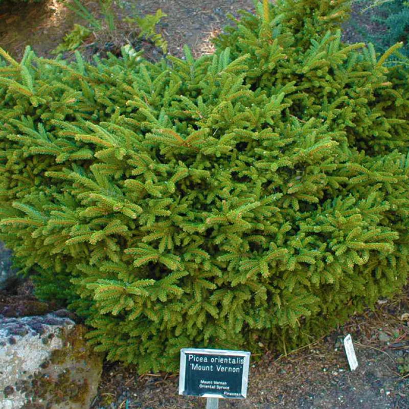 A very slow-growing, dense dwarf spruce forming a low, rounded mound of glossy dark green needles. Its compact habit and fine texture make it an excellent choice for rock gardens, foundations, and mixed conifer plantings where long-term size control is important.