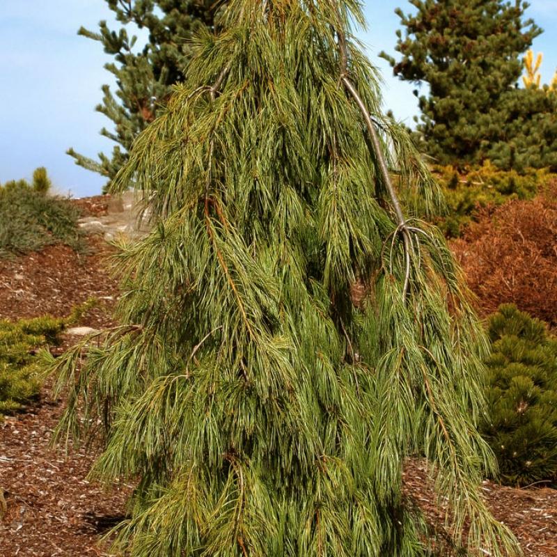 A more refined version of weeping white pine, 'Angel Falls' has long, narrow, light blue-green needles and a strong weeping habit.