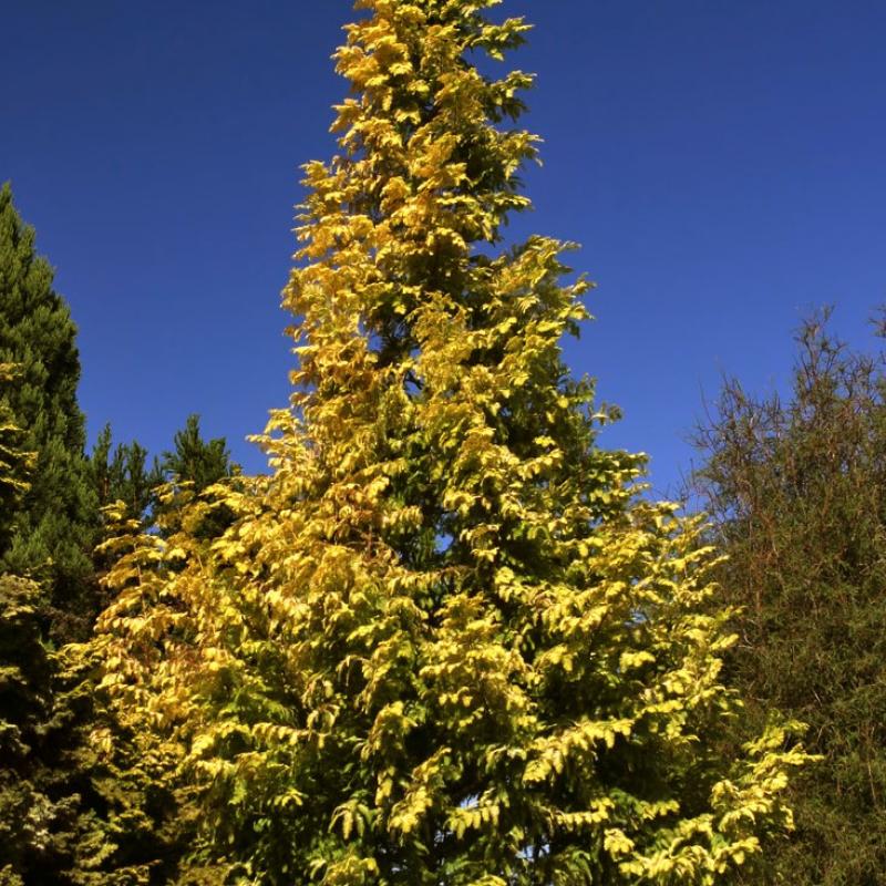Intense, golden-yellow, feathery foliage makes this striking new cultivar easily recognizable. Although a conifer, this tree's foliage changes to copper-brown in fall and drops, leaving an elegant frame with horizontal branching.