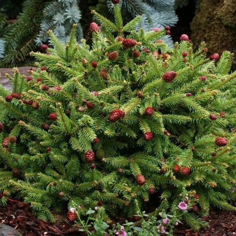 Bright red cones will decorate this specimen on its many short branches during the spring before turning brown as the summer progresses. Irregularly globose when young, 'Pusch' will develop an upright broad shape with maturity.