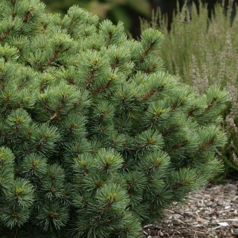 Short, blue-green needles adorn the branches of this attractive dwarf pine. Dense bushy growth makes the plant even more appealing, while a windswept form gives a Japanese aesthetic to the plant.