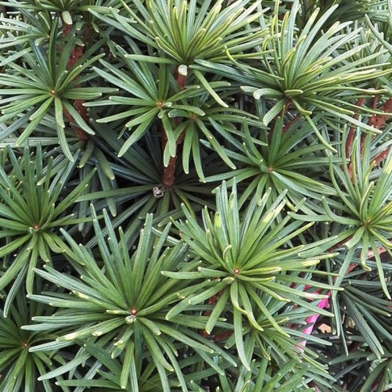 The comparatively short, succulent, dark green, glossy needles of 'Green Star' radiate outwardly in a distinctive star-like pattern on the short, stocky branches of this slow growing tree.