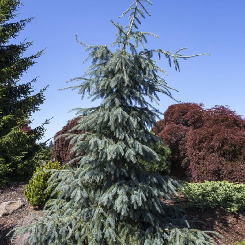 'Bush's Lace' exhibits a vigorous growing form with a strong central leader, shining blue-green needles and branches that extend out before drooping downward. The branching is uniquely irregular, making it a stately presence in the garden.