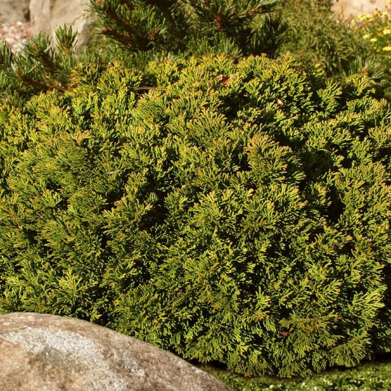 Compact sprays of mid-green, dense, finely textured foliage decorate this tightly branched, small, rounded plant that ultimately grows wider than tall.