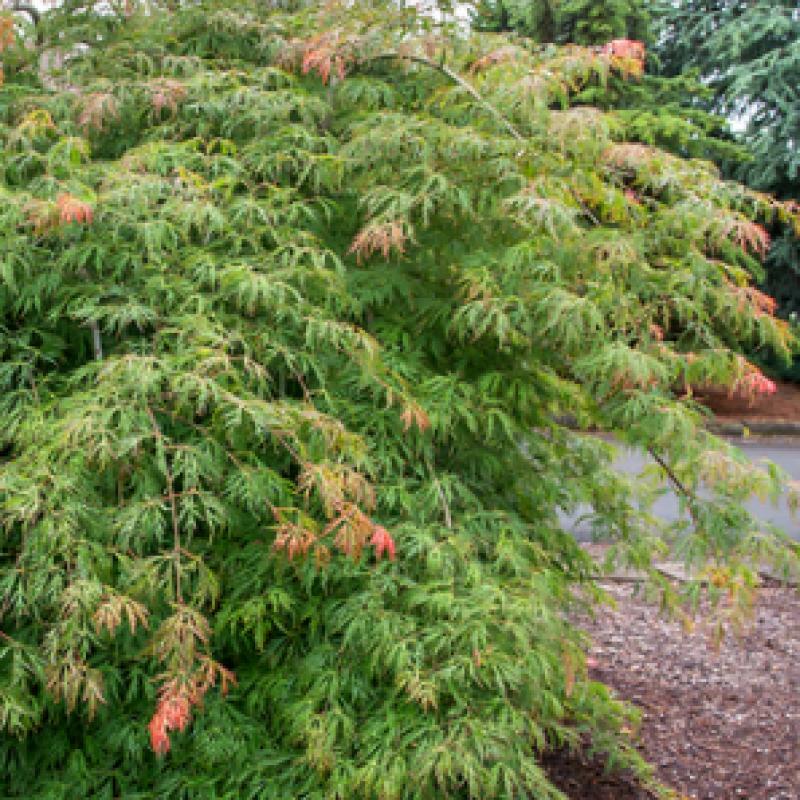 'Ice Dragon' is the smallest in the Jack Frost series of hardy Japanese Maples. It has a slightly cascading habit and lacy leaves. Its foliage is reddish in spring, green in summer and a lovely yellow, orange and red in fall.