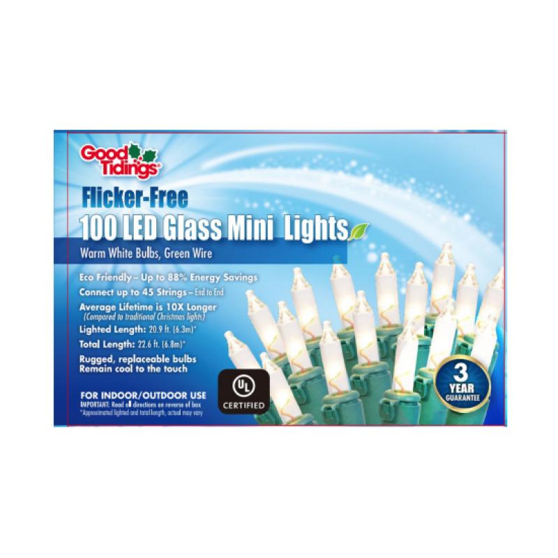 This 100-count flicker-free LED light set features warm white bulbs for a classic glow indoors or outdoors. Designed with green wire and a reflector-style look, these micro lights offer improved water resistance for reliable seasonal use. String-to-string connectivity makes it easy to expand your display, and each set comes neatly packaged in a color box.