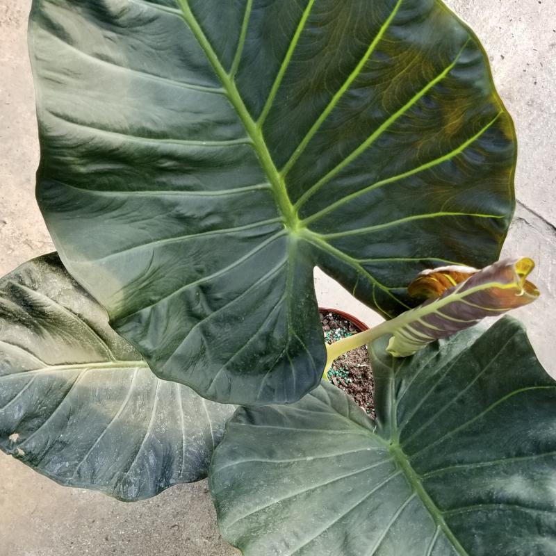 Alocasia 'Regal Shield' has durable dark green foliage with contrasting light green venation. It's stunning arrow-shaped leaves fittingly give it the name Elephant Ears. These tropical plants love humidity and can become a great focal point for any room.