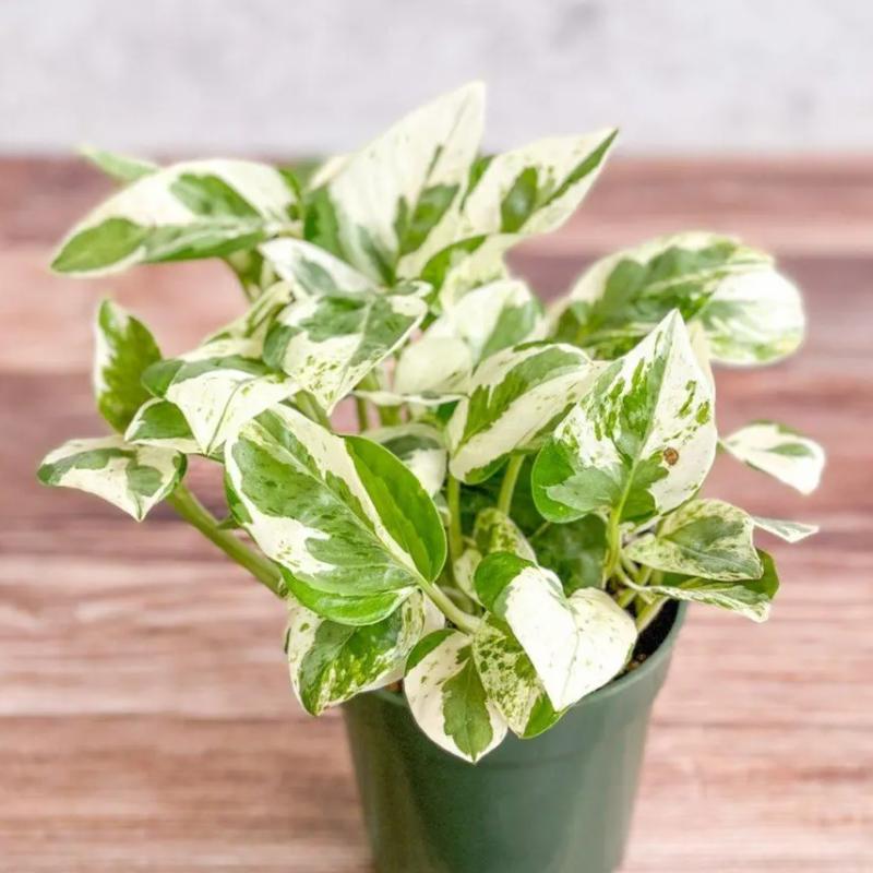 Marble Queen' is a climber known for interesting, marbled green and white, heart-shaped leaves on a trailing stem.