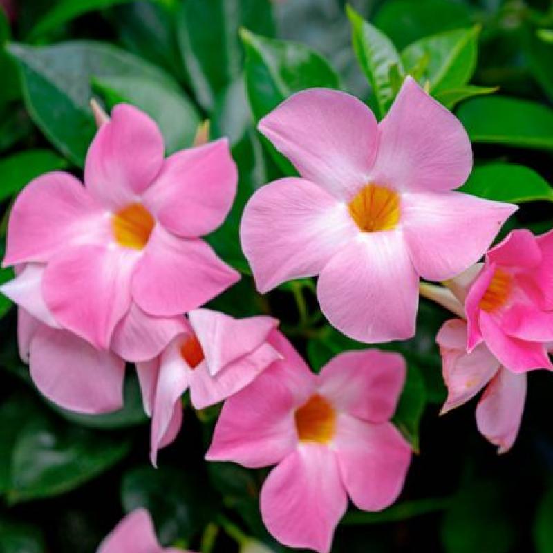 Delicate pink blooms with golden throats brighten up this compact vining mandevilla. A charming and vigorous grower for sunny spaces, perfect for trellises, containers, and hanging displays.
