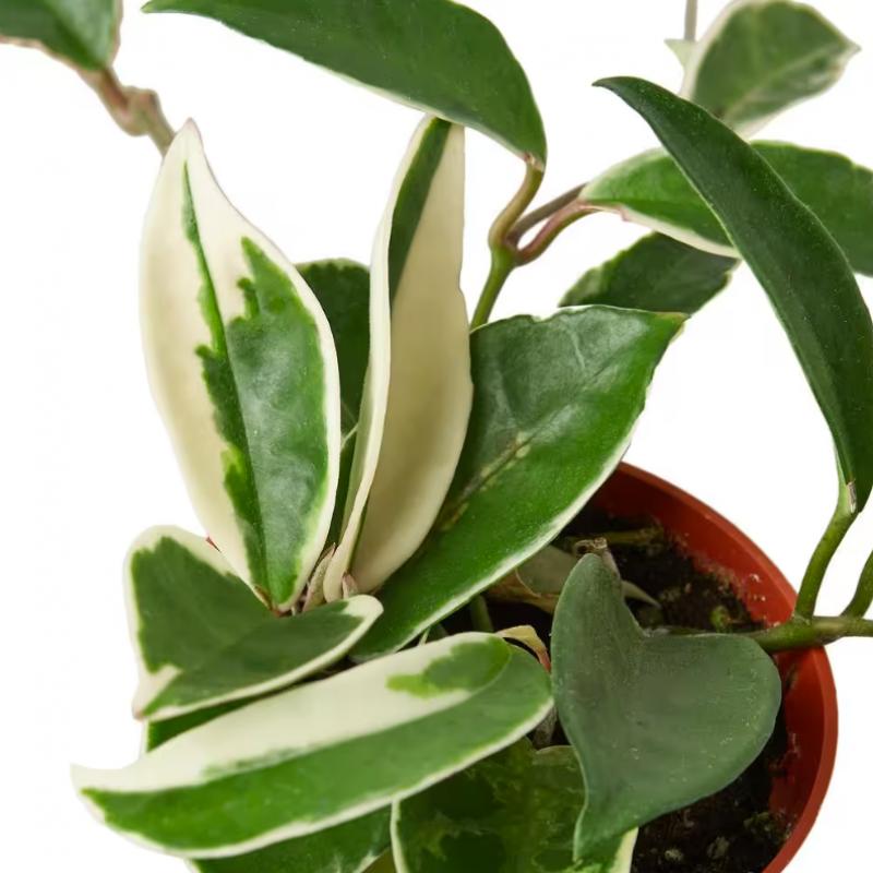 A vibrant trailing hoya with waxy green leaves edged in creamy white, often with blushes of pink on new growth. Ideal for hanging baskets or training along a trellis indoors, this low-maintenance plant may produce fragrant star-shaped flowers in ideal conditions.