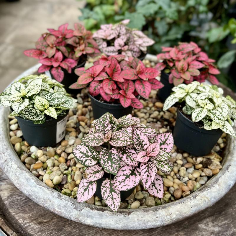 A shrubby plant with oval leaves mottled with pink spots and a woody base. Prune back to prevent leggy growth.
