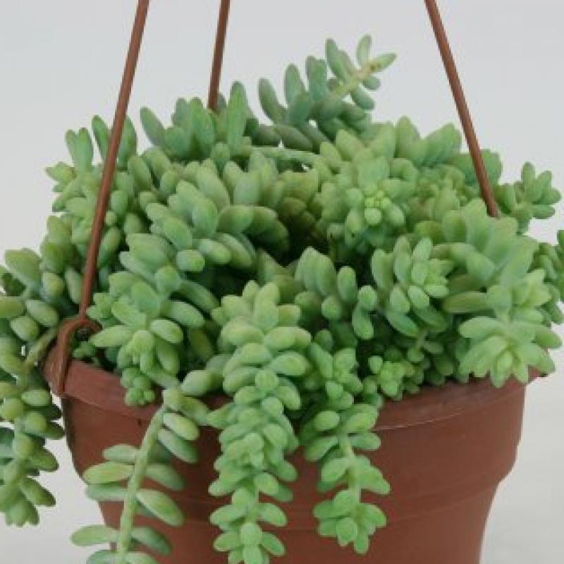 A native of Mexico, this plant makes an attractive succulent plant for hanging baskets. The spindle-shaped leaves have a silver-blue cast to them and the pendulous branches may reach 3 feet or more in baskets.