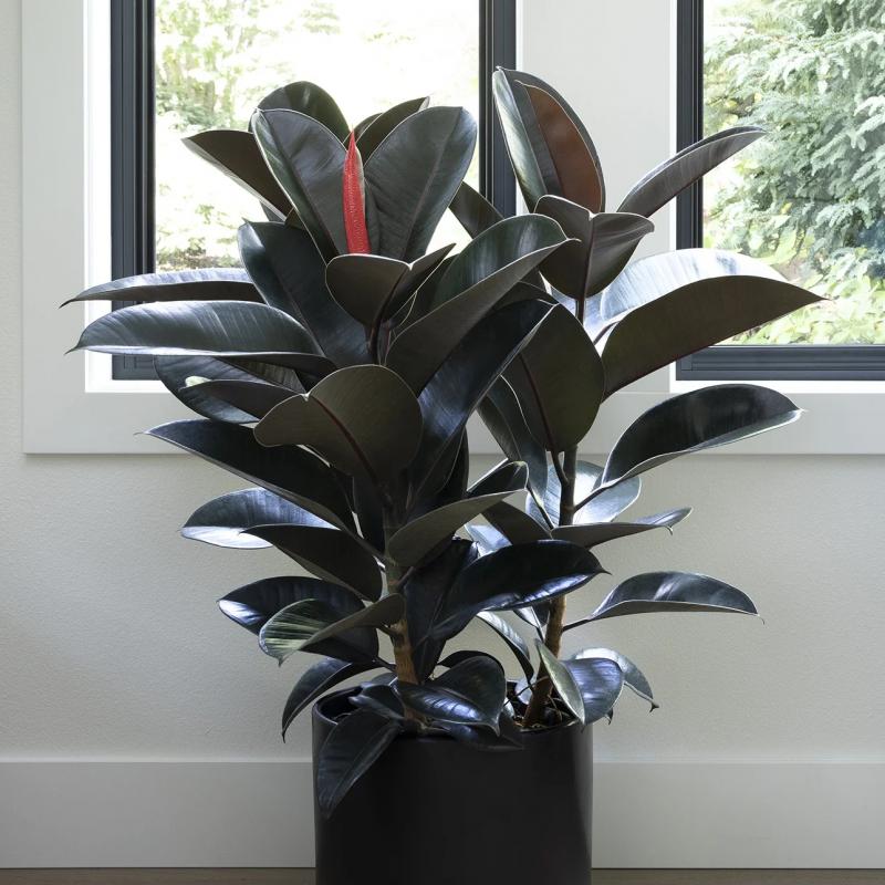 A bold and sophisticated houseplant featuring deep burgundy leaves with a glossy finish. ‘Abidjan’ brings dramatic color and structure to indoor spaces, thriving in bright, indirect light and adding a modern, sculptural touch.